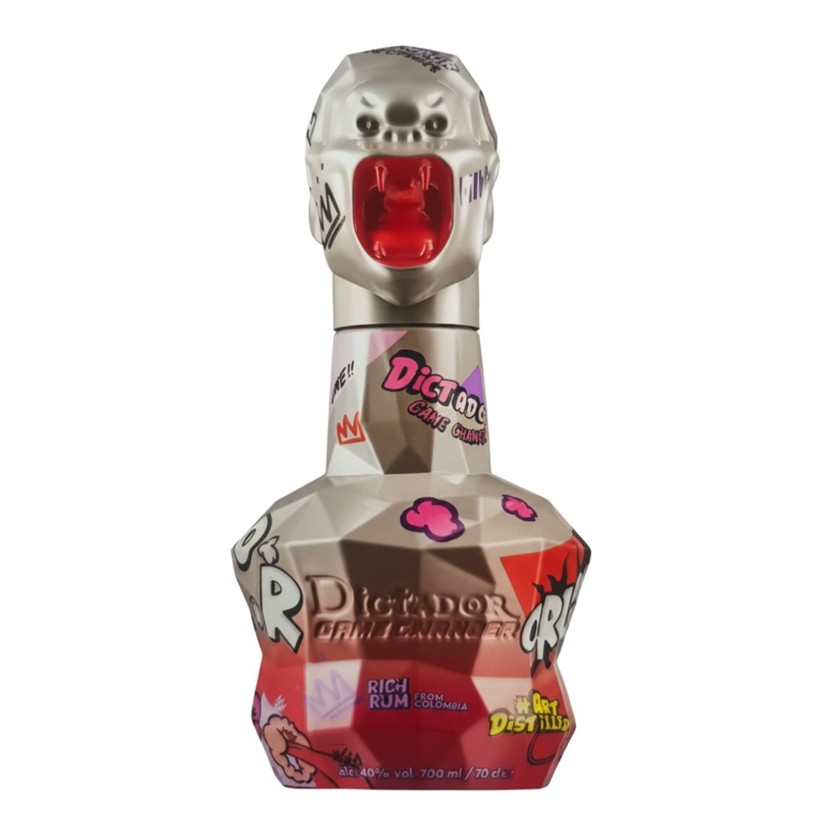 Die ikonische Form der Dictador-Flasche erhält hier die künstlerische Handschrift von Richard Orlinski. Die Kombination aus auffälliger Farbgebung in Beige & Orange, Street-Art-Elementen und einem Verschluss in Form eines Kongo-Kopfes macht diese Edition zu einem attraktiven Geschenk und Sammlerstück.
